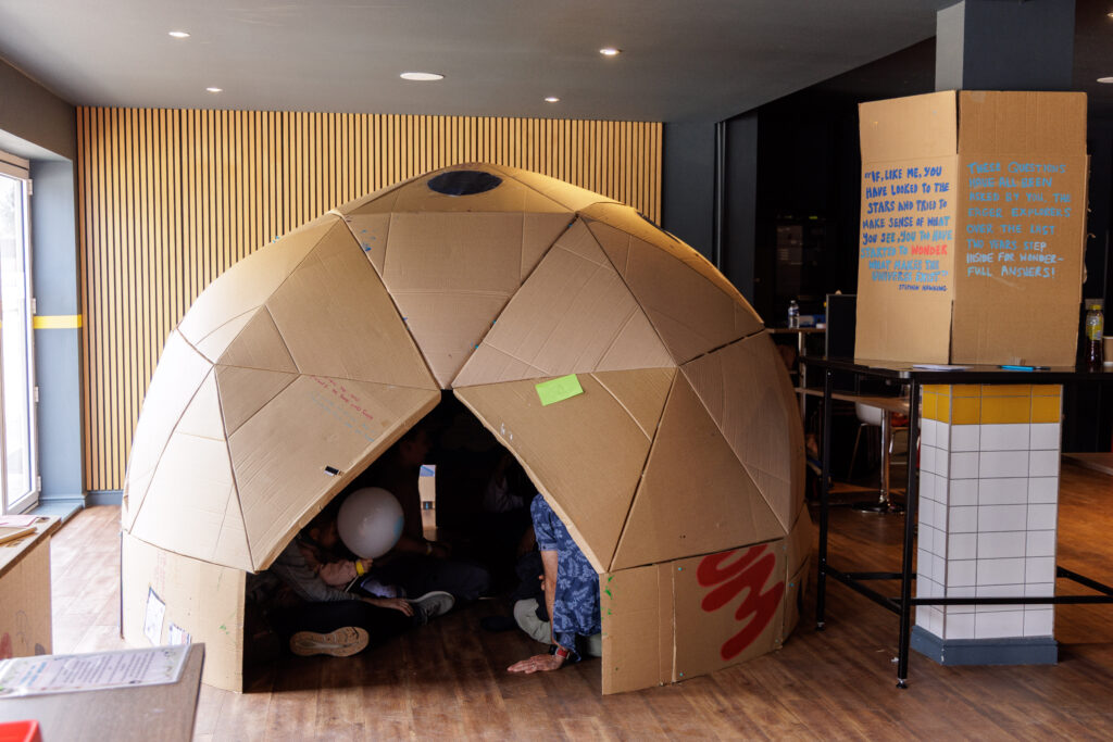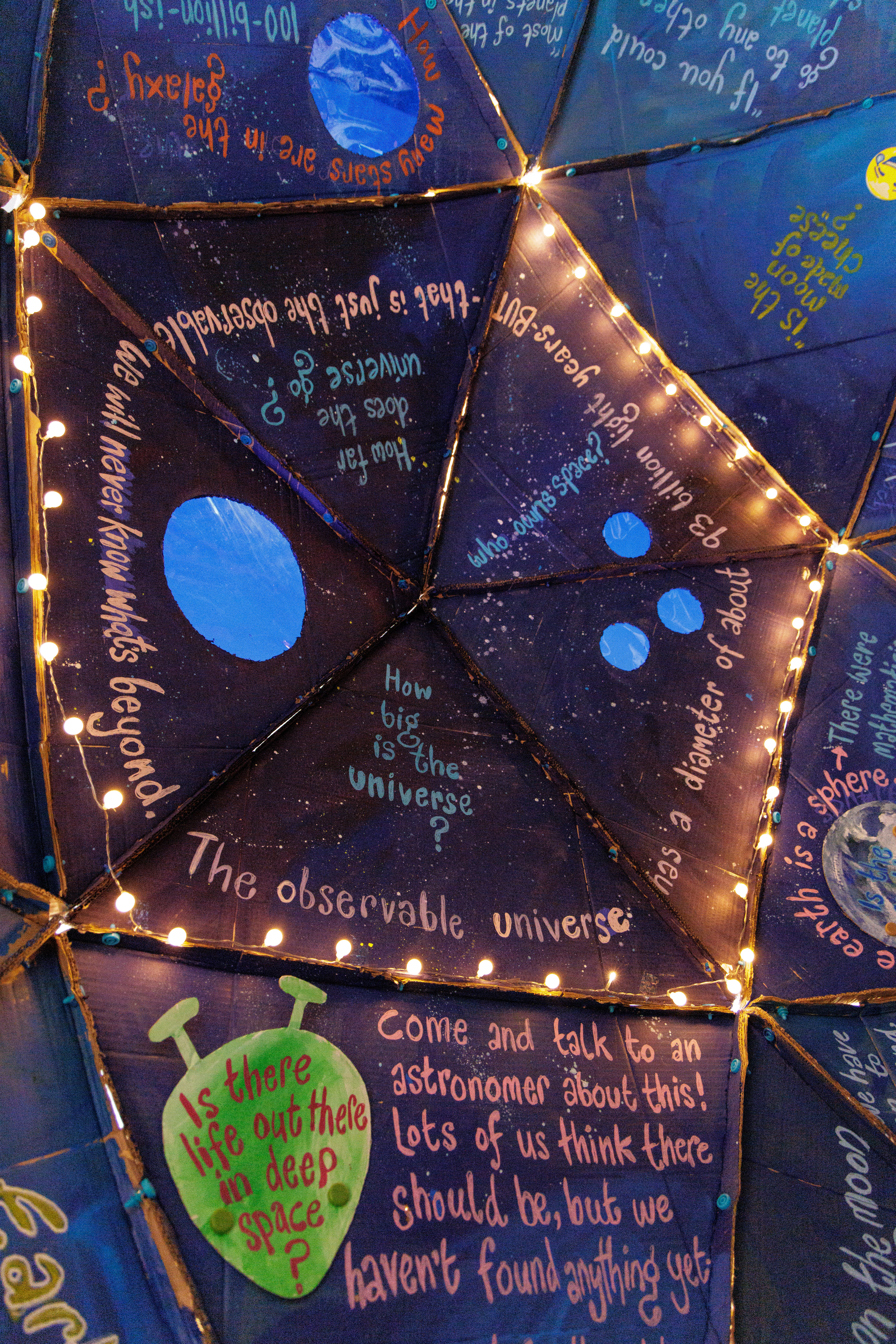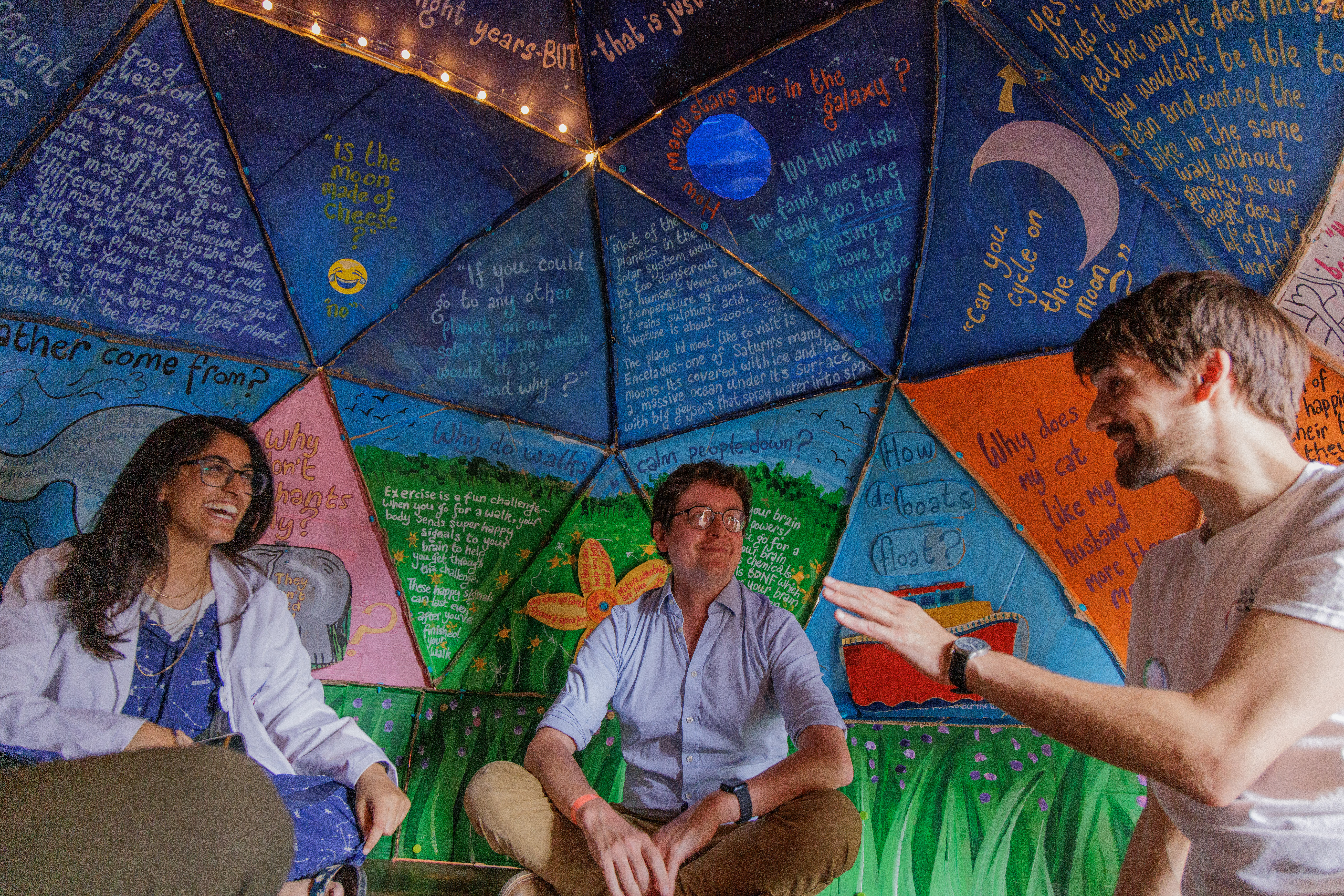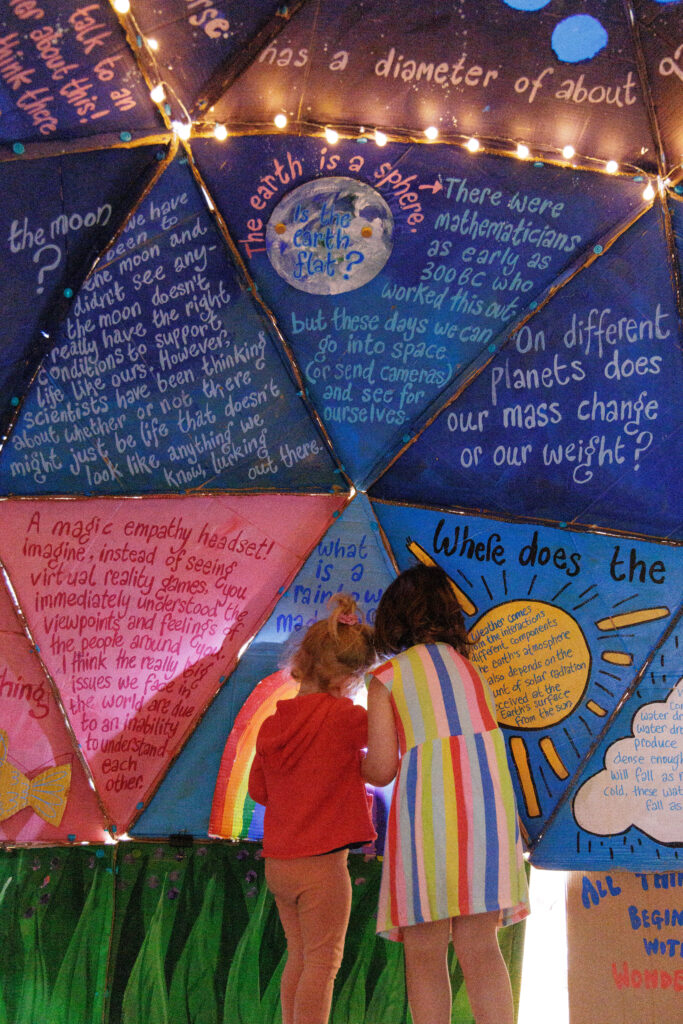 Working with local community artist Hilary Cox Condron, we created a Wonder Dome. The dome was left cardboard coloured on the outside, to inspire a home-grown, accessible feeling. The inside was covered in the questions posed by Abbey residents, and the answers which we had found. These answers were supplied by scientists across the university, and we are very grateful for their time and support.