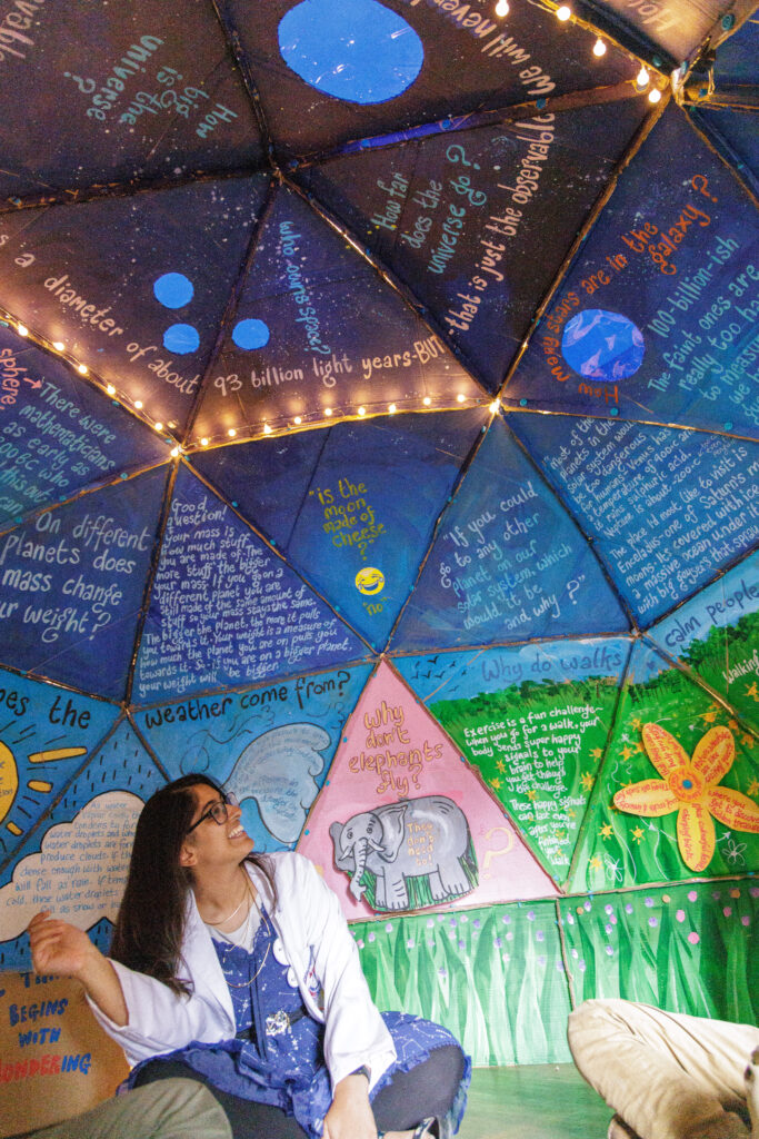 The dome could comfortably fit small groups inside, and so we could gather there to discuss scientific questions and answers. Oftentimes, as the younger attendees enjoyed exploring the dome and its tactile features, our supporting scientists were able to have conversations about science with their accompanying adults.